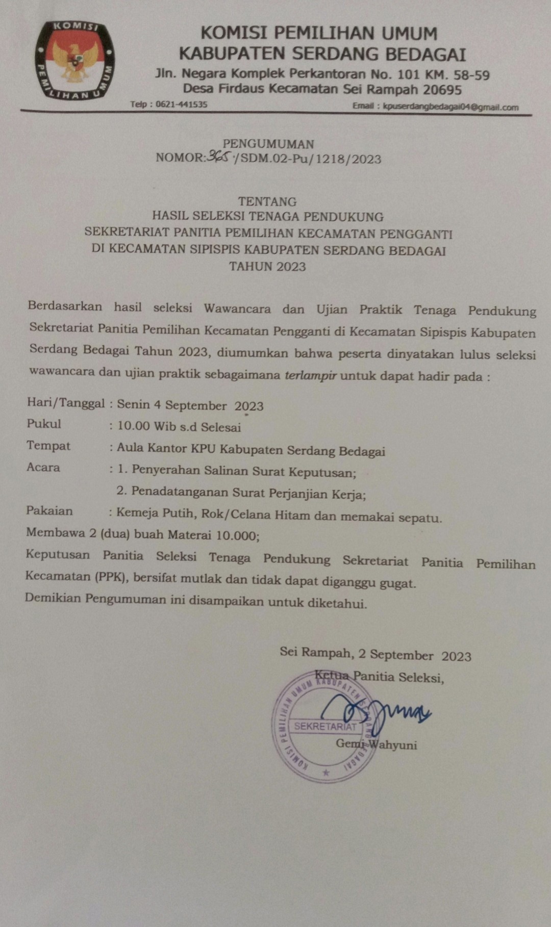 PENGUMUMAN HASIL SELEKSI TENAGA PENDUKUNG SEKRETARIAT PPK PENGGANTI DI KECAMATAN SIPISPIS