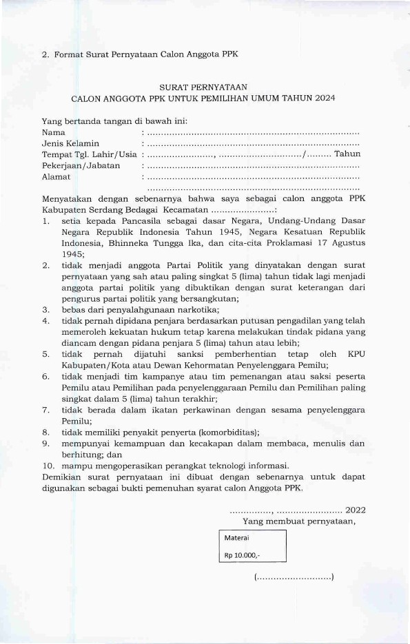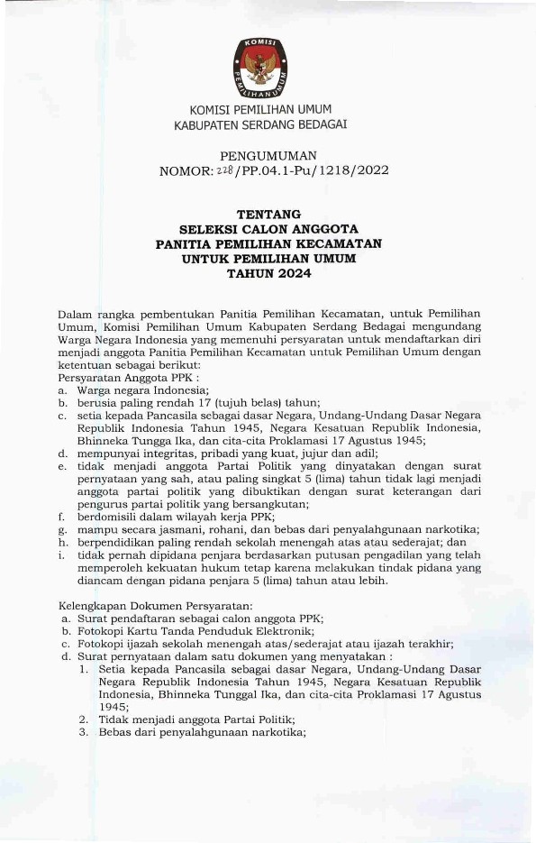 Pengumuman Pendaftaran Badan Ad Hoc Panitia Pemilihan Kecamatan (PPK) Pemilihan Umum Tahun 2024