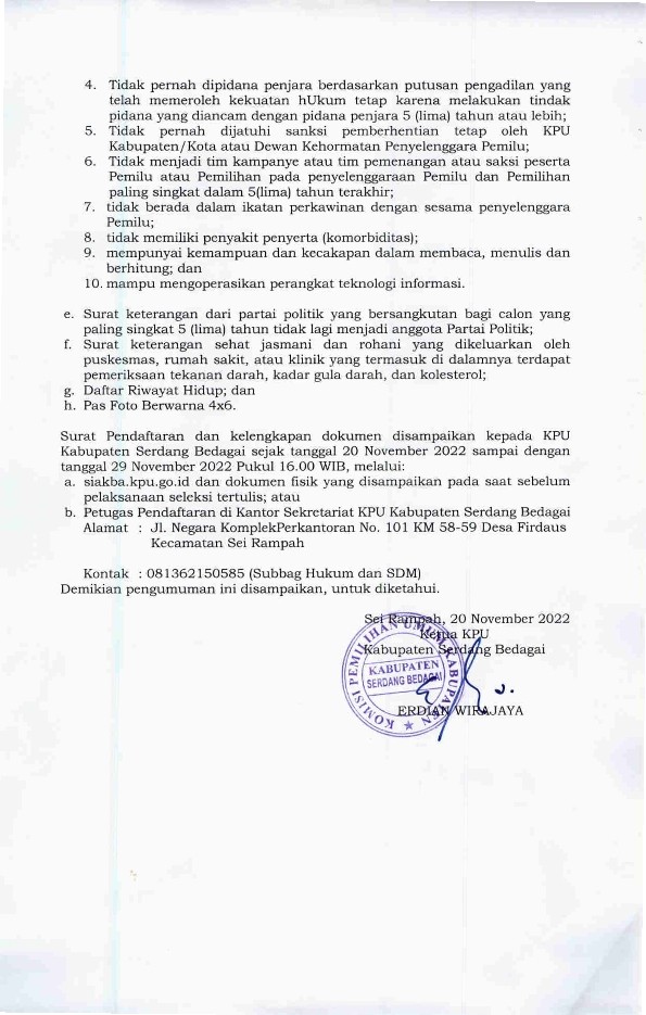 Sei Rampah, 20 November 2022 | KPU Kabupaten Serdang Bedagai mengumumkan Pendaftaran Badan Ad Hoc Pemilihan Umum Tahun 2024.