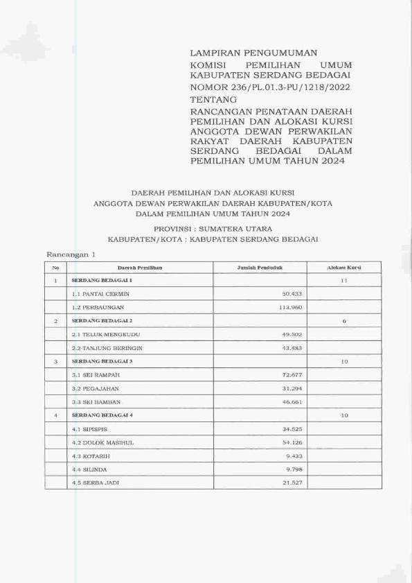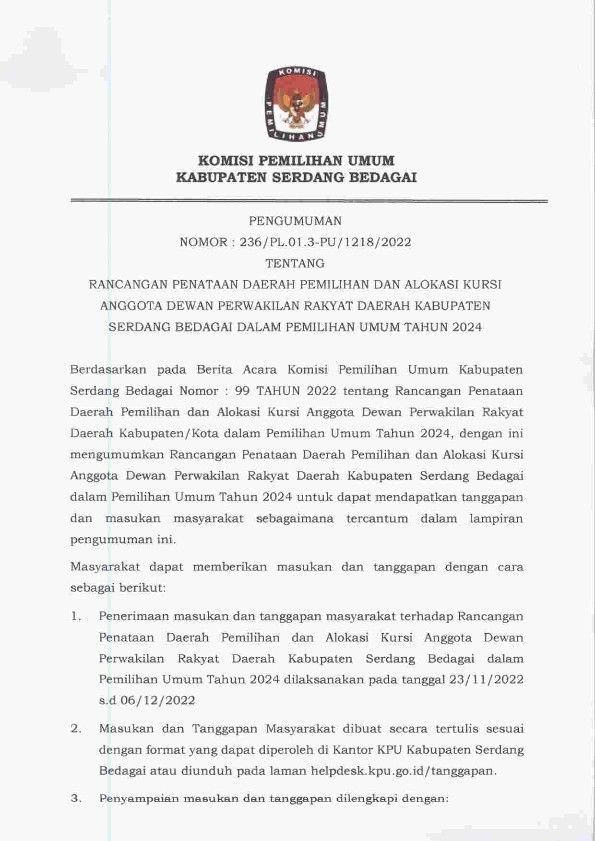 PENGUMUMAN RANCANGAN PEMETAAN DAERAH PEMILIHAN DAN ALOKASI KURSI ANGGOTA DEWAN PERWAKILAN RAKYAT DAERAH KABUPATEN SERDANG BEDAGAI DALAM PEMILU 2024