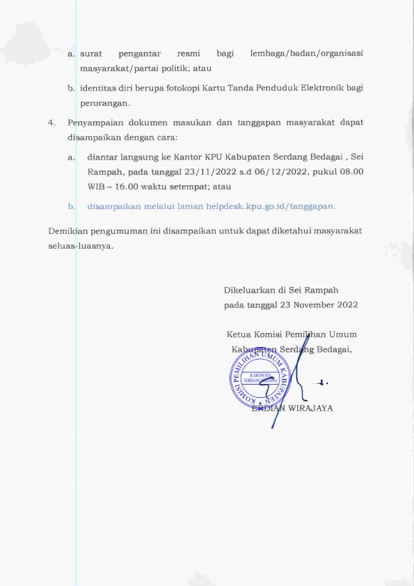 Sei Rampah, 23 November 2022 | Komisi Pemilihan Umum (KPU) Kabupaten Serdang Bedagai mengumumkan Rancangan Pemetaan Daerah Pemilihan (DAPIL) dan Alokasi Kursi Dewan Perwakilan Rakyat Daerah (DPRD) Kabupaten Serdang Bedagai dalam Pemilihan Umum Tahun 2024. Pada Rancangan Pemetaan DAPIL dan Alokasi Kursi DPRD Kabupaten Serdang Bedagai, KPU Kabupaten Serdang Bedagai menerima masukan dan tanggapan masyarakat mulai tanggal 23 November 2022 sampai dengan 6 Desember 2022 secara tertulis sesuai format yang dapat diperoleh di Kantor KPU Kabupaten Serdang Bedagai atau diunduh pada laman helpdesk.kpu.go.id.