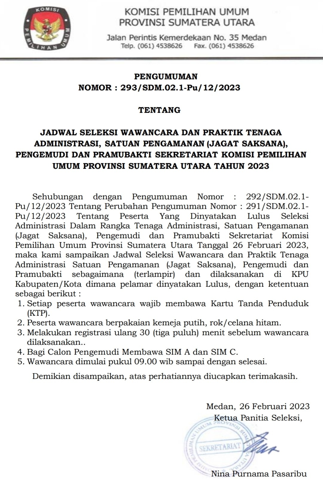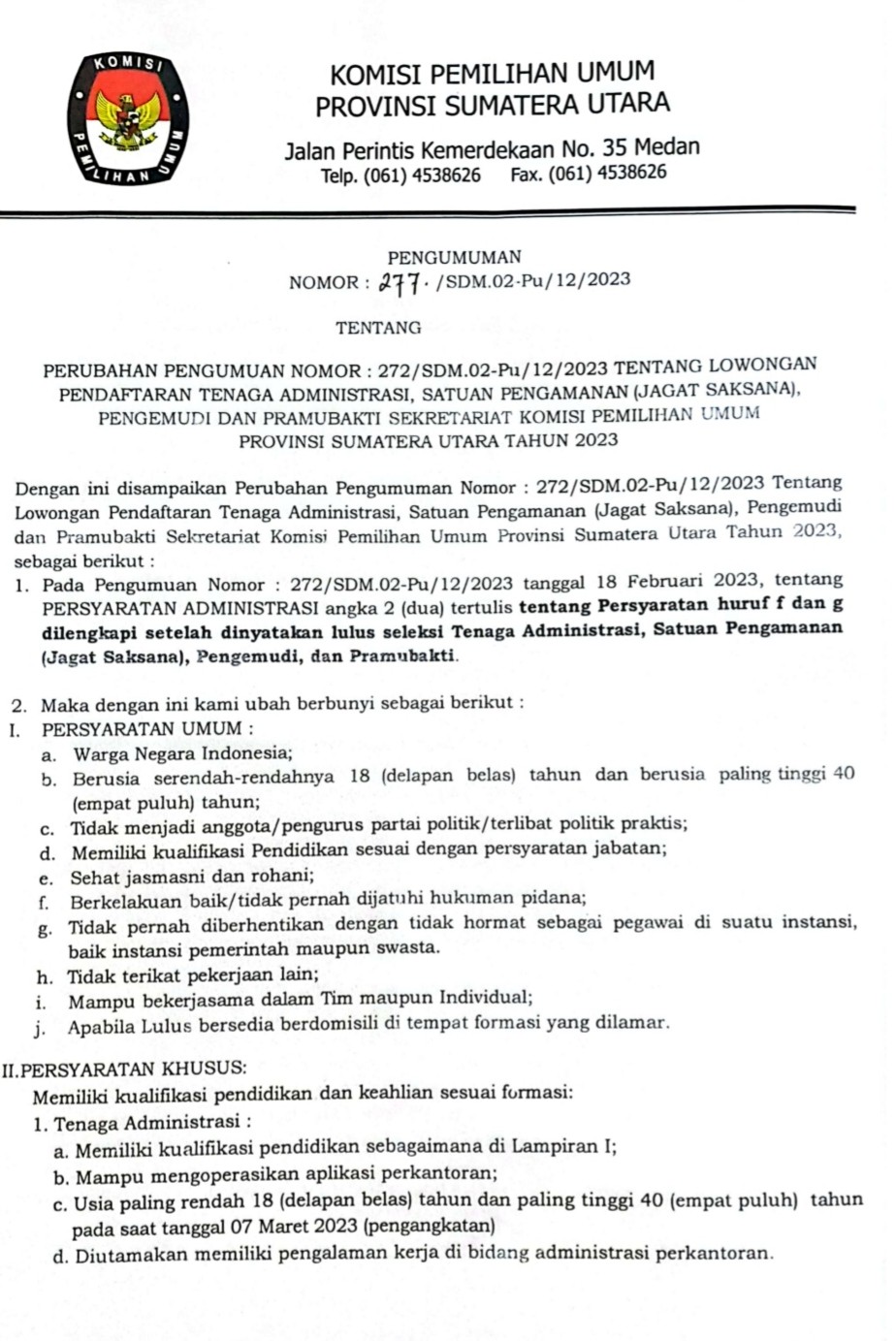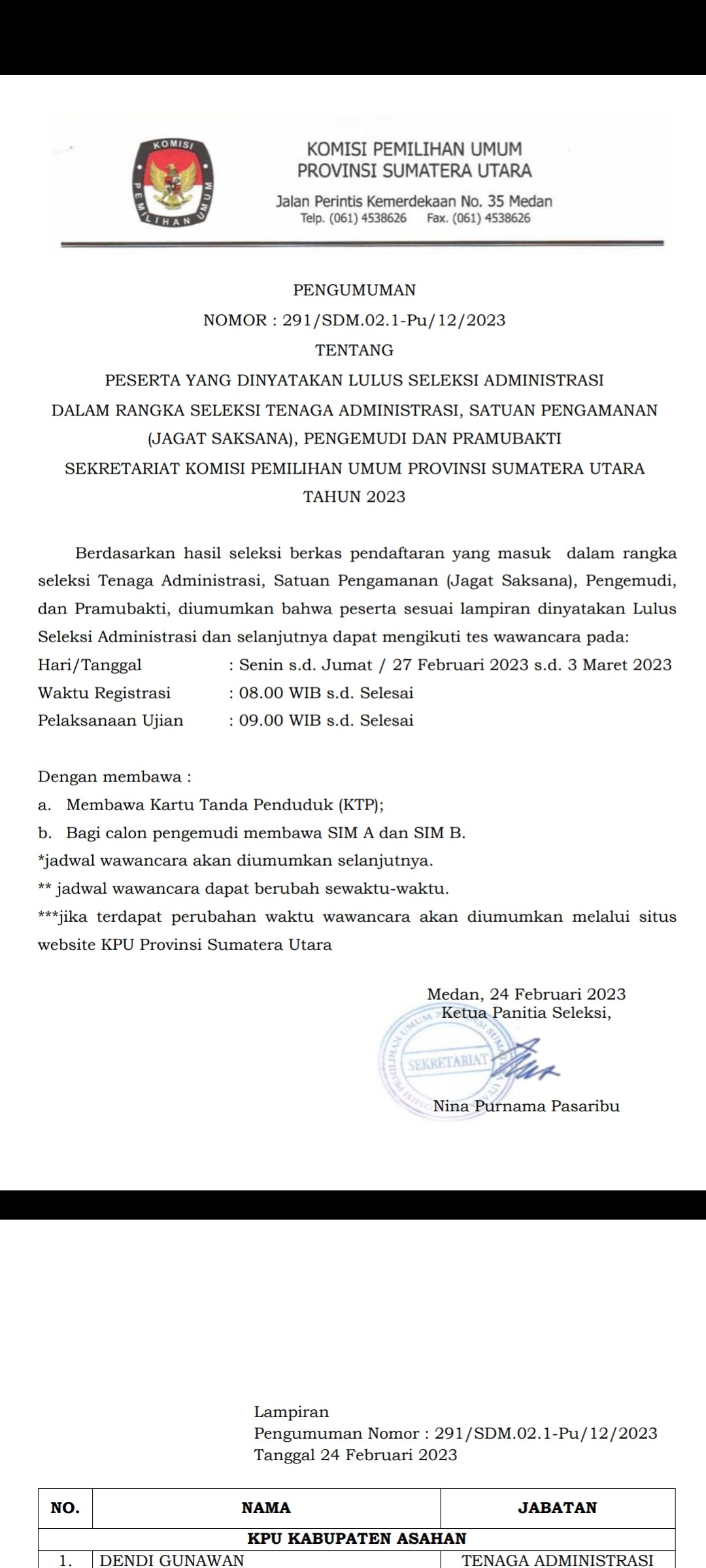 Sei Rampah, 25 Ferbruari 2023 | KPU Provinsi Sumatera Utara mengumumkan hasil seleksi administrasi perekrutan Tenaga Administrasi, Satuan Pengamanan (Jagat Saksana), Pengemudi dan Pramubakti pada Sekretariat KPU Provinsi Sumatera Utara Tahun 2023. Pengumuman selengkapnya dapat dilihat disini