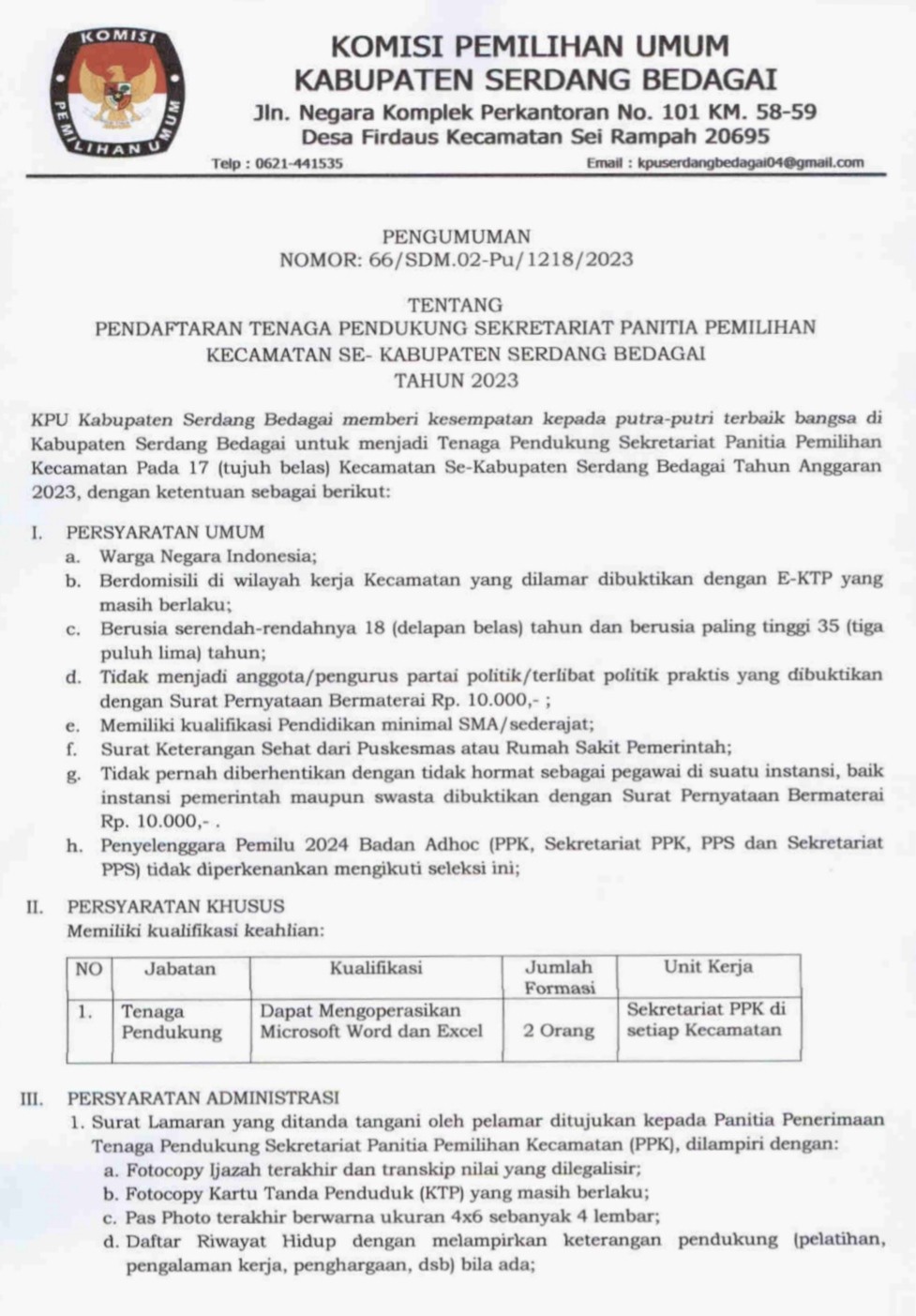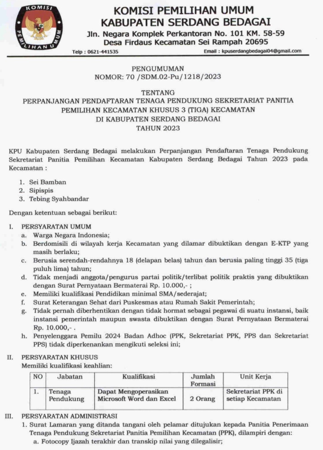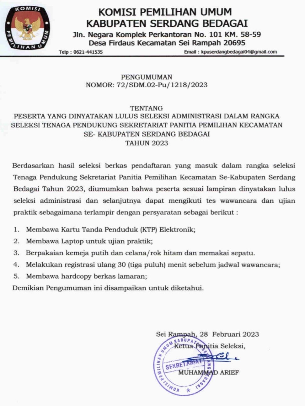 Sei Rampah, 25 Ferbruari 2023 | KPU Provinsi Sumatera Utara mengumumkan hasil seleksi administrasi perekrutan Tenaga Administrasi, Satuan Pengamanan (Jagat Saksana), Pengemudi dan Pramubakti pada Sekretariat KPU Provinsi Sumatera Utara Tahun 2023. Pengumuman selengkapnya dapat dilihat disini