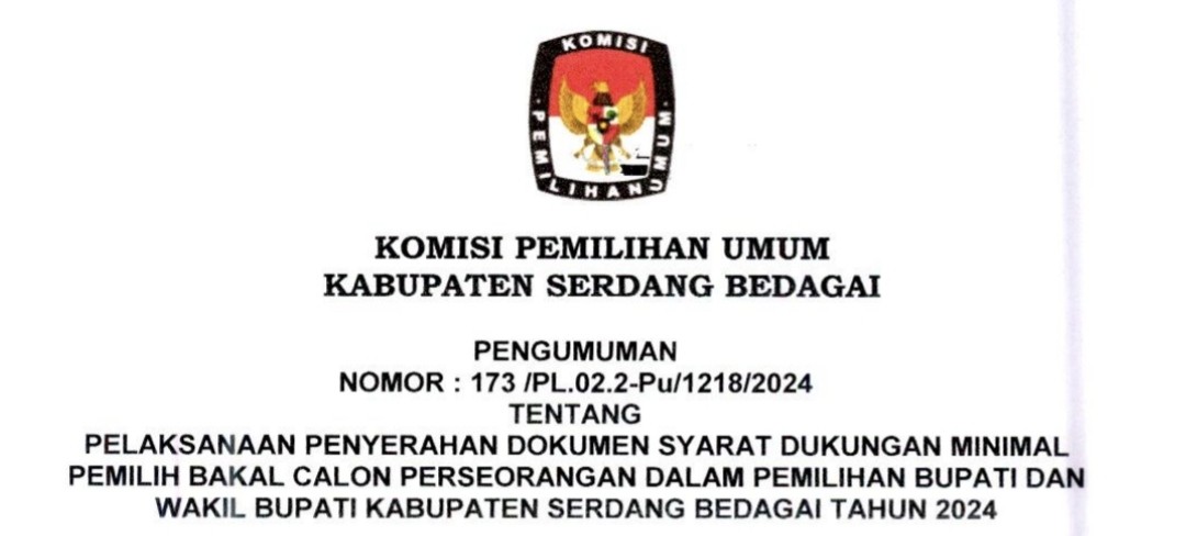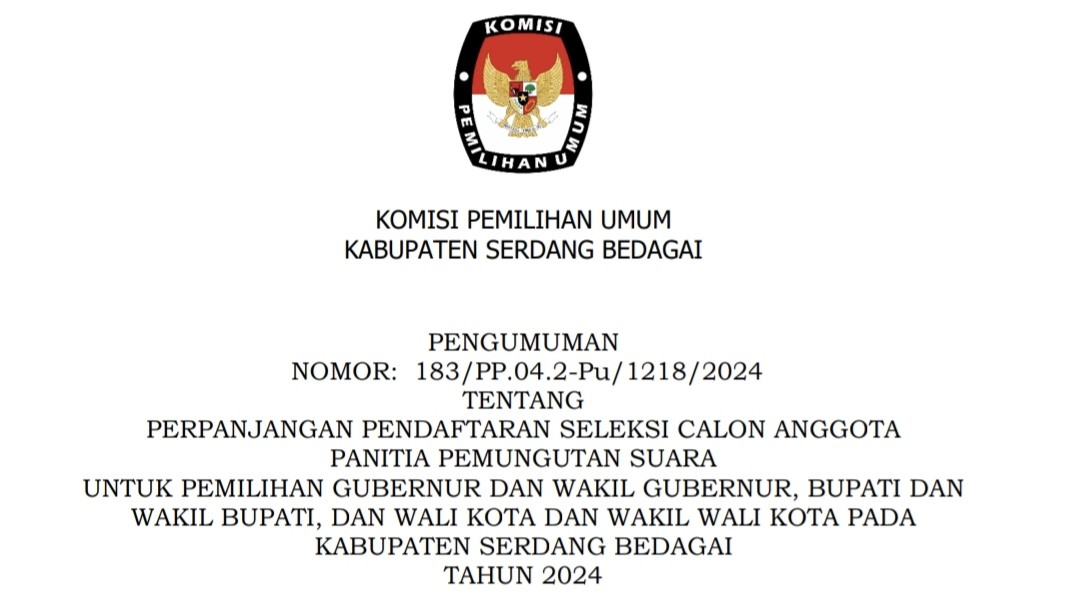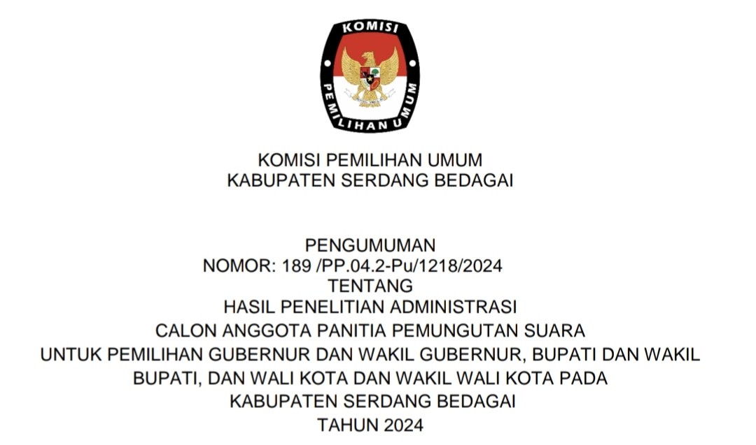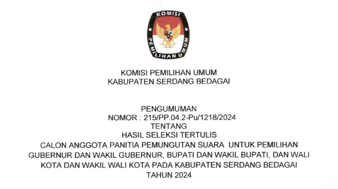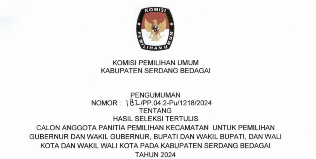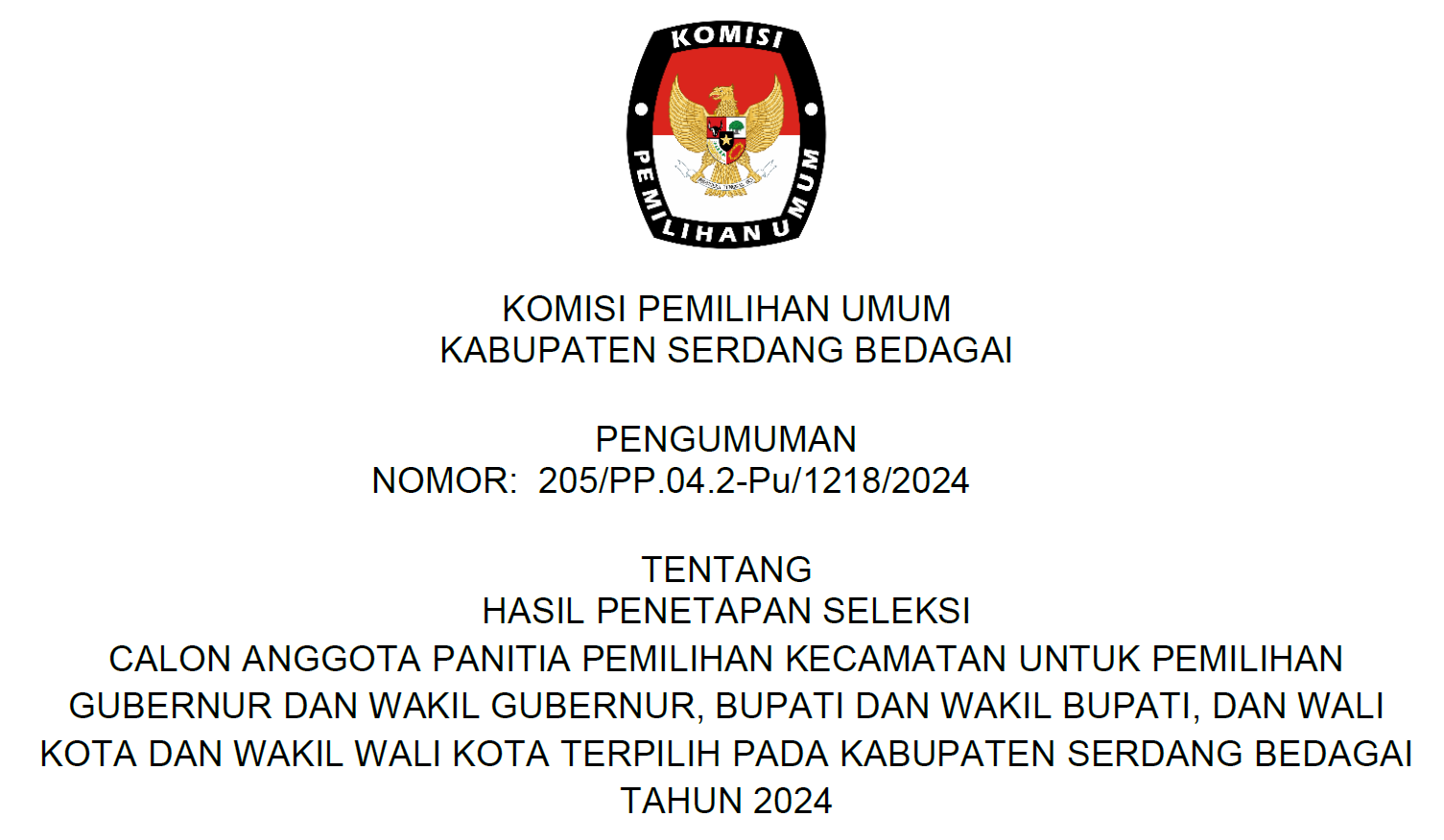 PENGUMUMAN HASIL PENETAPAN SELEKSI CALON ANGGOTA PANITIA PEMILIHAN KECAMATAN UNTUK PEMILIHAN GUBERNUR DAN WAKIL GUBERNUR, BUPATI DAN WAKIL BUPATI, DAN WALI KOTA DAN WAKIL WALI KOTA TERPILIH PADA KABUPATEN SERDANG BEDAGAI TAHUN 2024