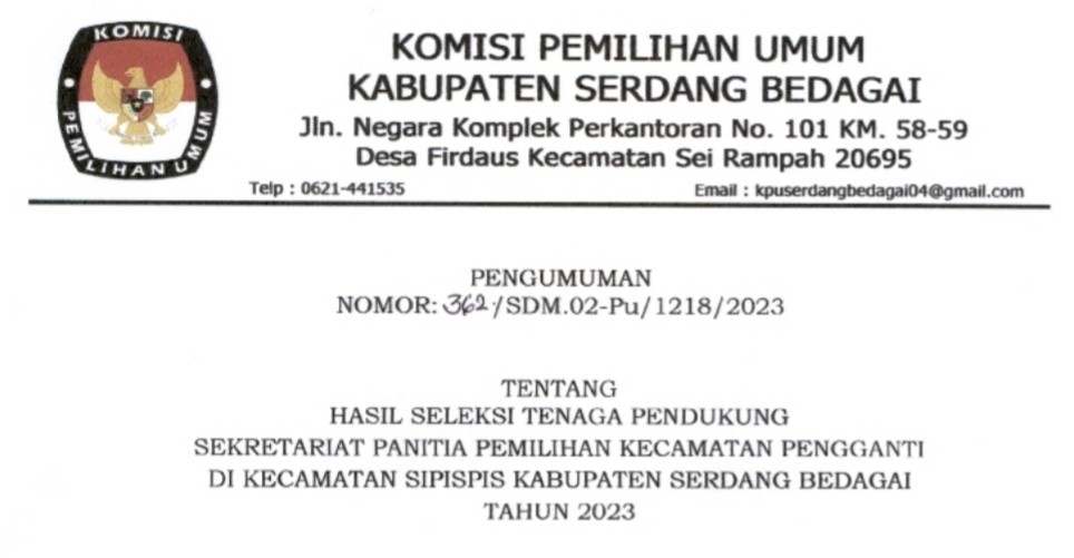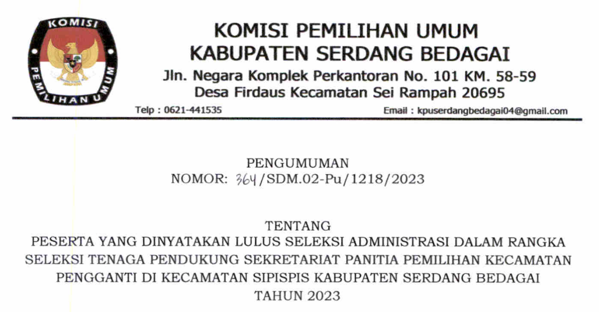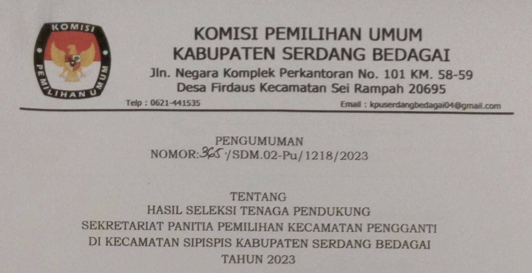 Pengumuman hasil seleksi Tenaga Pendukung Sekretariat Panitia Pemilihan Kecamatan Pengganti di Kecamatan Sipispis. Pengumuman lengkapnya dapat dilihat disini