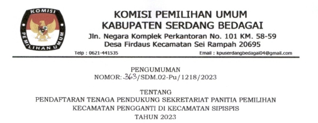 Pengumuman Pendaftaran Tenaga Pendukung Sekretariat Panitia Pemilihan Kecamatan (PPK) di Kecamatan Sipipis Kabupaten Serdang Bedagai Tahun 2023. Pengumuman lengkapnya dapa dilihat disini.