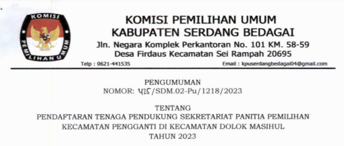 Pengumuman Pendaftaran Tenaga Pendukung Pengganti Panitia Pemilihan Kecamatan (PPK) di Kecamatan Dolok Masihul Tahun 2023. Pengumuman lengkapnya dapat dilihat disini.