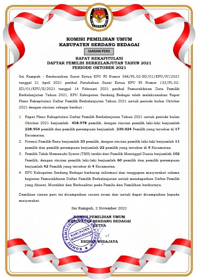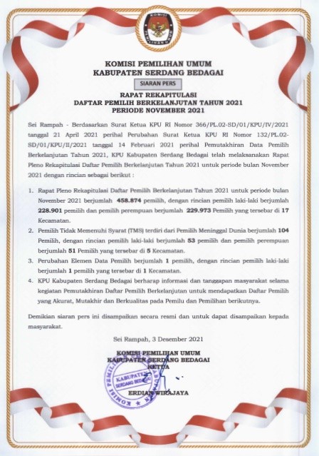 Sei Rampah | 3 Desember 2021 – Berdasarkan Surat Ketua KPU RI Nomor 366/PL.02-SD/01/KPU/IV/2021 tanggal 21 April 2021 perihal Perubahan Surat Ketua KPU RI Nomor 132/PL.02-SD/01/KPU/II/2021 tanggal 14 Februari 2021 perihal Pemutakhiran Data Pemilih Berkelanjutan Tahun 2021, KPU Kabupaten Serdang Bedagai telah melaksanakan Rapat Pleno Rekapitulasi Daftar Pemilih Berkelanjutan Tahun 2021 untuk periode bulan November 2021. Rapat Pleno Rekapitulasi Daftar Pemilih Berkelanjutan Tahun 2021 untuk periode bulan November 2021 berjumlah 458.874 pemilih, dengan rincian pemilih laki-laki berjumlah 228.901 pemilih dan pemilih perempuan berjumlah 229.973 Pemilih yang tersebar di 17 Kecamatan. Pemutakhiran Daftar Pemilih Berkelanjutan meliputi Pemilih Tidak Memenuhi Syarat (TMS) yang terdiri dari Pemilih Meninggal Dunia berjumlah 104 Pemilih, dengan rincian pemilih laki-laki berjumlah 53 pemilih dan pemilih perempuan berjumlah 51 Pemilih yang tersebar di 5 Kecamatan serta Perubahan Elemen Data Pemilih berjumlah 1 pemilih, dengan rincian pemilih laki-laki berjumlah 1 pemilih yang tersebar di 1 Kecamatan. KPU Kabupaten Serdang Bedagai berharap informasi dan tanggapan masyarakat selama kegiatan Pemutakhiran Daftar Pemilih Berkelanjutan untuk mendapatkan Daftar Pemilih yang Akurat, Mutakhir dan Berkualitas pada Pemilu dan Pemilihan berikutnya.